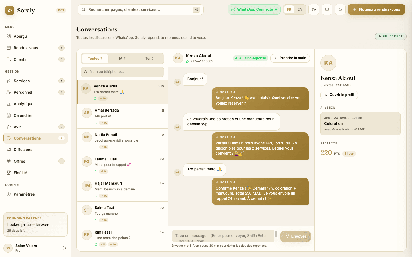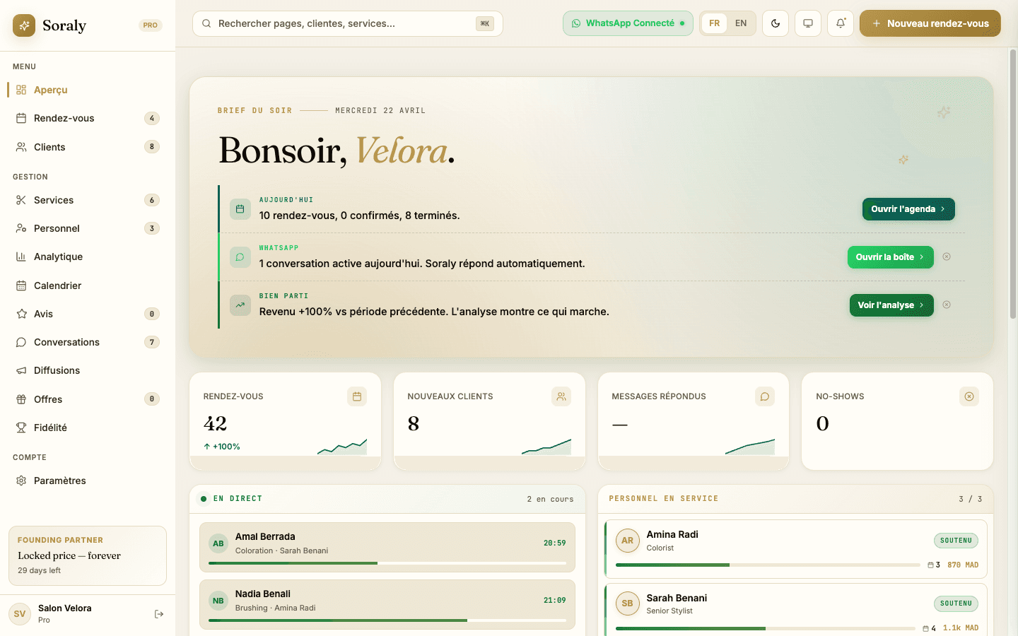 Avant la première cliente, Soraly a déjà répondu à trois messages. WhatsApp est connecté, l'agent IA actif, et la journée commence avec +100% de revenu vs semaine précédente.
