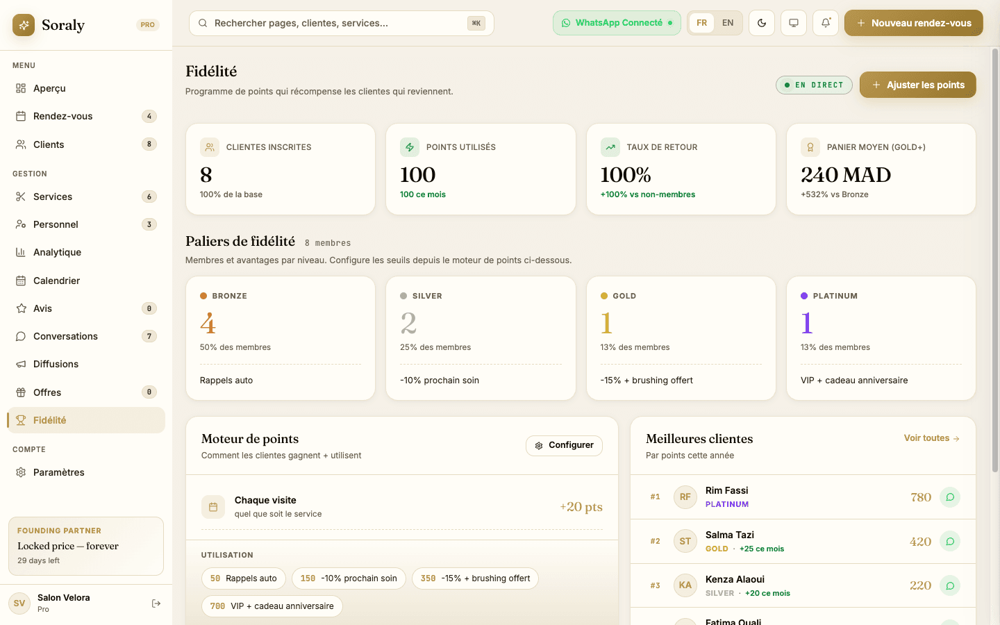 Avec sa réservation de demain, Kenza franchit les 150 points. Soraly applique automatiquement -10% sur son prochain soin kératine, et lui envoie un message de félicitations.